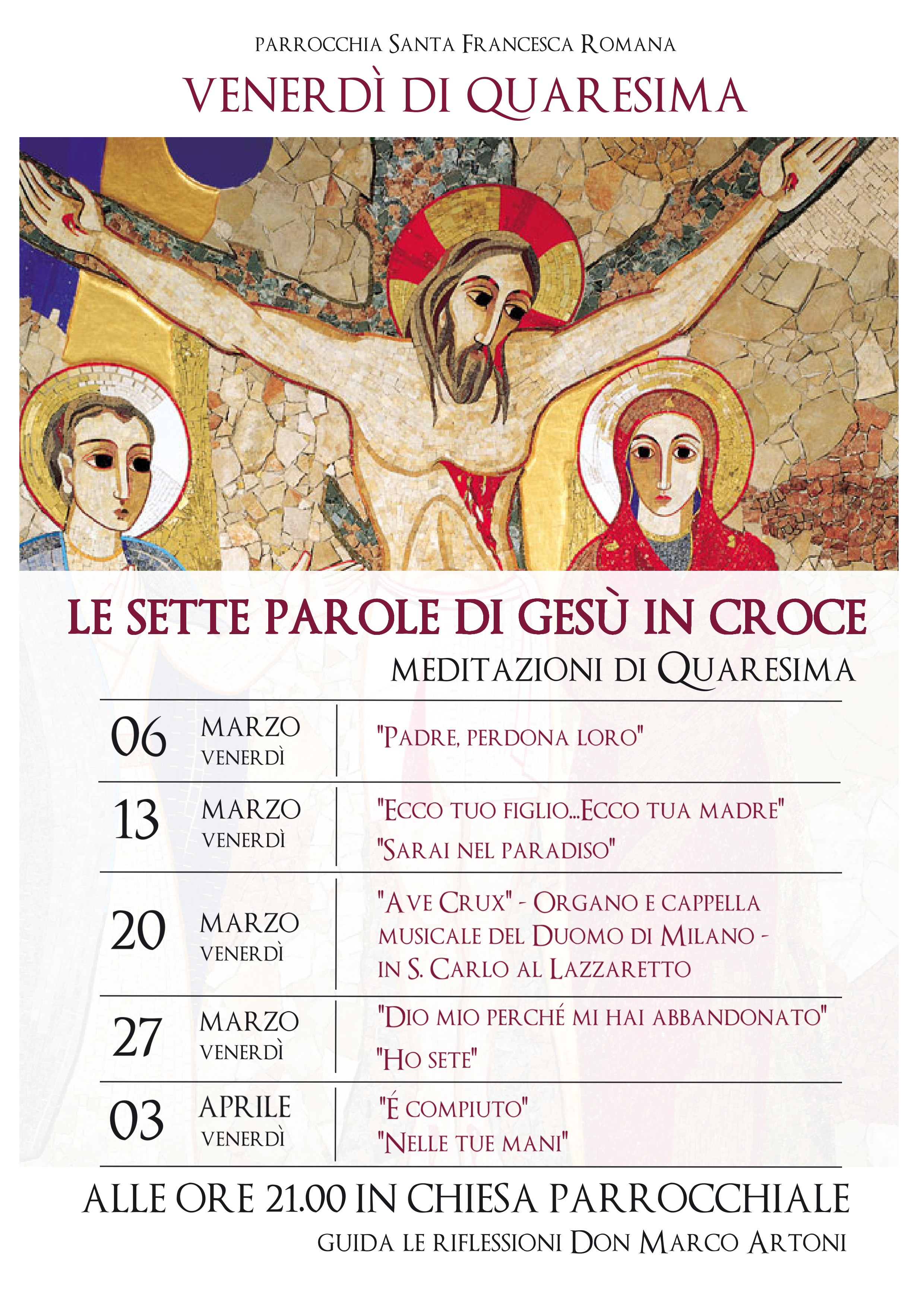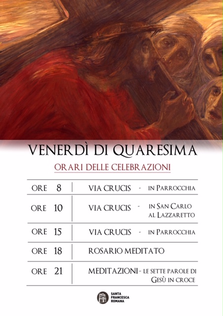 A causa delle disposizioni regionali le meditazioni sulle “Sette parole di Gesù sulla croce” guidate da d. Marco, che si sarebbero dovute tenere in S. Francesca R. alle 21, sono al momento sospese.
